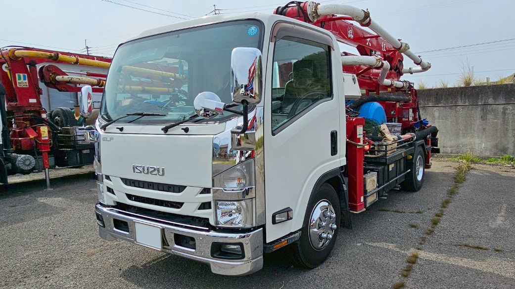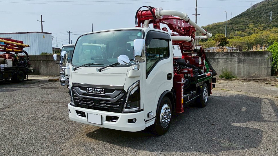 コンクリートポンプ車は、建設現場で生コンクリートを打設現場に圧送する自動車です。ミキサートラックなどで運ばれてきた生コンクリートを、ホッパで受け、ポンプ機構により輸送管を通して目的の場所へ圧送します。